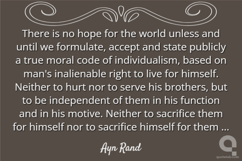 There is no hope for the world unless and until we formulate, accept and state publicly a true moral code of individualism, based on man's inalienable right to live for himself. Neither to hurt nor to serve his brothers, but to be independent of them in his function and in his motive. Neither to sacrifice them for himself nor to sacrifice himself for them ...
