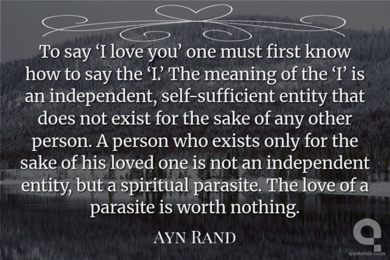 To say ‘I love you’ one must first know how to say the ‘I.’ The meaning of the ‘I’ is an independent, self-sufficient entity that does not exist for the sake of any other person. A person who exists only for the sake of his loved one is not an independent entity, but a spiritual parasite. The love of a parasite is worth nothing.