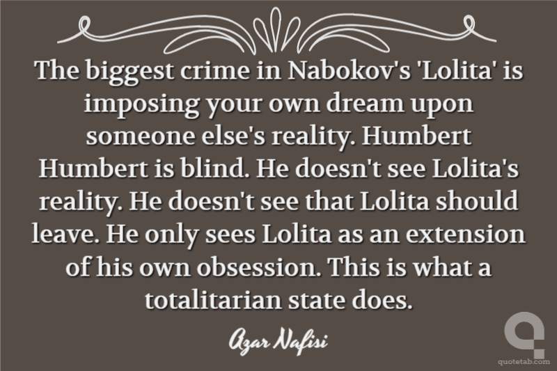 The biggest crime in Nabokov's 'Lolita' is imposing your own dream upon someone else's reality. Humbert Humbert is blind. He doesn't see Lolita's reality. He doesn't see that Lolita should leave. He only sees Lolita as an extension of his own obsession. This is what a totalitarian state does.