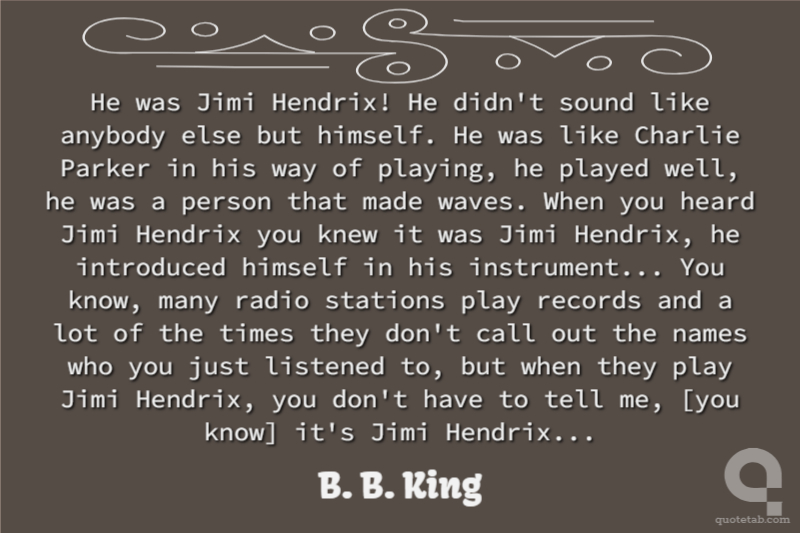 He was Jimi Hendrix! He didn't sound like anybody else but himself. He was like Charlie Parker in his way of playing, he played well, he was a person that made waves. When you heard Jimi Hendrix you knew it was Jimi Hendrix, he introduced himself in his instrument... You know, many radio stations play records and a lot of the times they don't call out the names who you just listened to, but when they play Jimi Hendrix, you don't have to tell me, [you know] it's Jimi Hendrix...