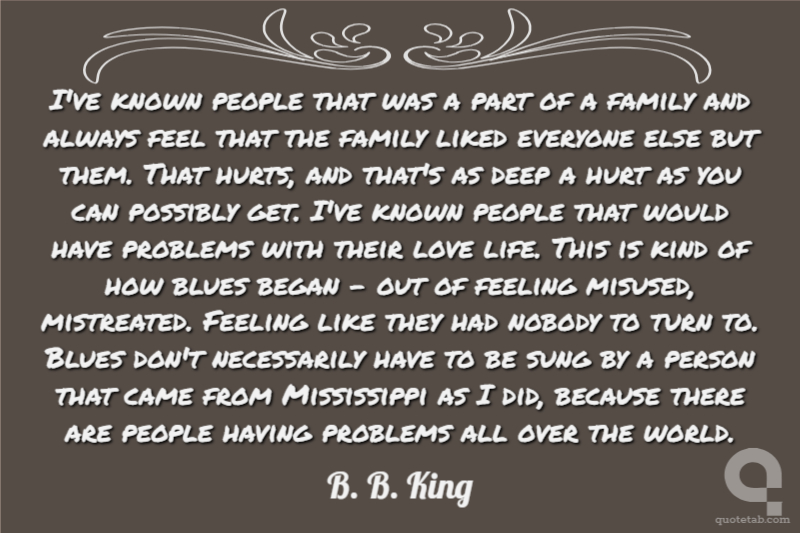 I've known people that was a part of a family and always feel that the family liked everyone else but them. That hurts, and that's as deep a hurt as you can possibly get. I've known people that would have problems with their love life. This is kind of how blues began - out of feeling misused, mistreated. Feeling like they had nobody to turn to. Blues don't necessarily have to be sung by a person that came from Mississippi as I did, because there are people having problems all over the world.