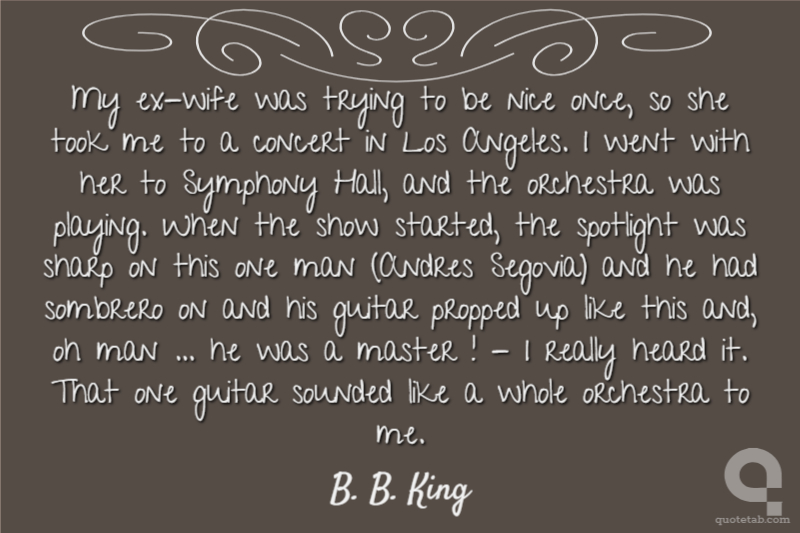 My ex-wife was trying to be nice once, so she took me to a concert in Los Angeles. I went with her to Symphony Hall, and the orchestra was playing. When the show started, the spotlight was sharp on this one man (Andres Segovia) and he had sombrero on and his guitar propped up like this and, oh man ... he was a master ! - I really heard it. That one guitar sounded like a whole orchestra to me.