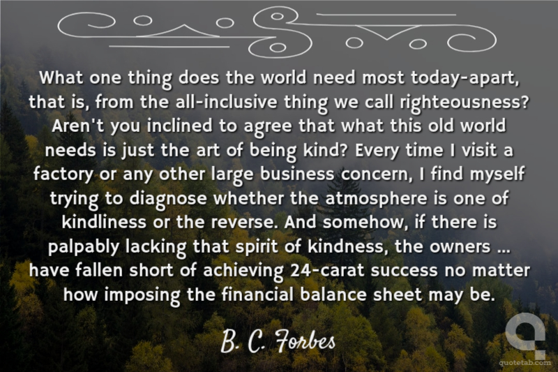 What one thing does the world need most today-apart, that is, from the all-inclusive thing we call righteousness? Aren't you inclined to agree that what this old world needs is just the art of being kind? Every time I visit a factory or any other large business concern, I find myself trying to diagnose whether the atmosphere is one of kindliness or the reverse. And somehow, if there is palpably lacking that spirit of kindness, the owners ... have fallen short of achieving 24-carat success no matter how imposing the financial balance sheet may be.