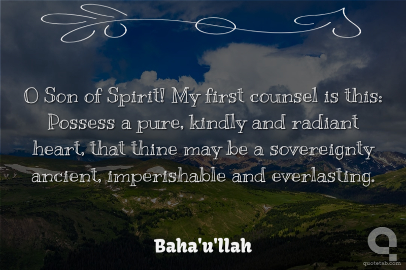 O Son of Spirit! My first counsel is this: Possess a pure, kindly and radiant heart, that thine may be a sovereignty ancient, imperishable and everlasting.