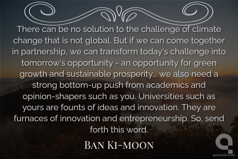There can be no solution to the challenge of climate change that is not global. But if we can come together in partnership, we can transform today's challenge into tomorrow's opportunity - an opportunity for green growth and sustainable prosperity... we also need a strong bottom-up push from academics and opinion-shapers such as you. Universities such as yours are founts of ideas and innovation. They are furnaces of innovation and entrepreneurship. So, send forth this word.