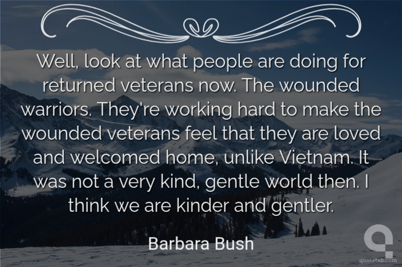 Well, look at what people are doing for returned veterans now. The wounded warriors. They're working hard to make the wounded veterans feel that they are loved and welcomed home, unlike Vietnam. It was not a very kind, gentle world then. I think we are kinder and gentler.