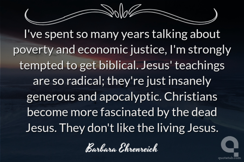 I've spent so many years talking about poverty and economic justice, I'm strongly tempted to get biblical. Jesus' teachings are so radical; they're just insanely generous and apocalyptic. Christians become more fascinated by the dead Jesus. They don't like the living Jesus.