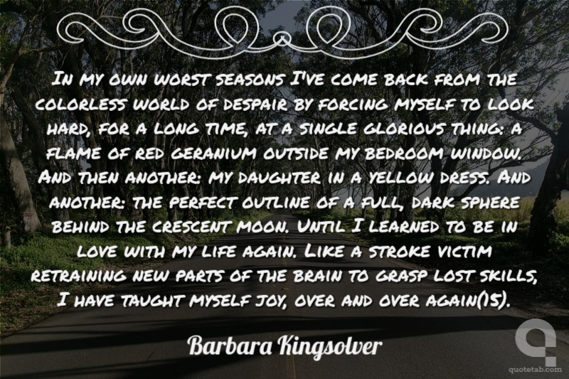 In my own worst seasons I've come back from the colorless world of despair by forcing myself to look hard, for a long time, at a single glorious thing: a flame of red geranium outside my bedroom window. And then another: my daughter in a yellow dress. And another: the perfect outline of a full, dark sphere behind the crescent moon. Until I learned to be in love with my life again. Like a stroke victim retraining new parts of the brain to grasp lost skills, I have taught myself joy, over and over again(15).