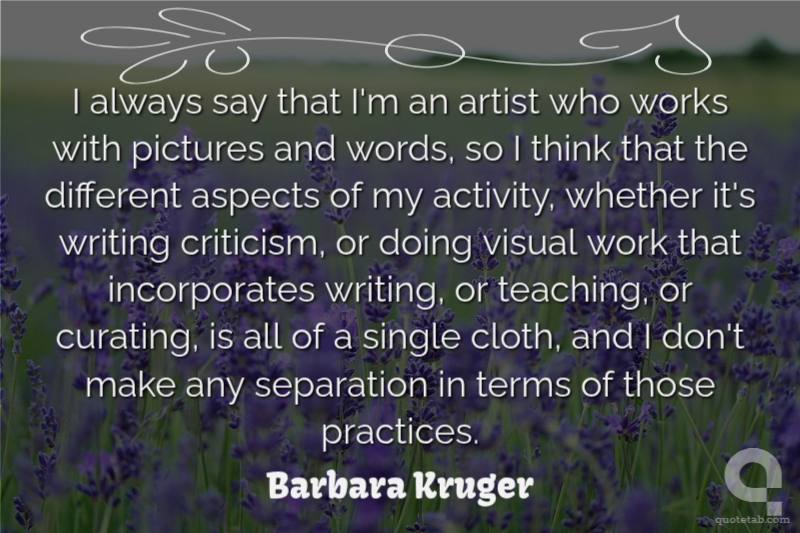 I always say that I'm an artist who works with pictures and words, so I think that the different aspects of my activity, whether it's writing criticism, or doing visual work that incorporates writing, or teaching, or curating, is all of a single cloth, and I don't make any separation in terms of those practices.