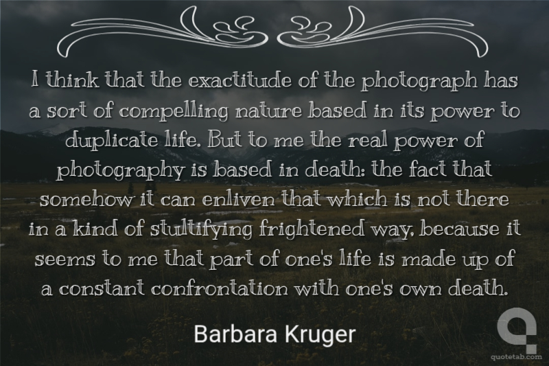 I think that the exactitude of the photograph has a sort of compelling nature based in its power to duplicate life. But to me the real power of photography is based in death: the fact that somehow it can enliven that which is not there in a kind of stultifying frightened way, because it seems to me that part of one's life is made up of a constant confrontation with one's own death.