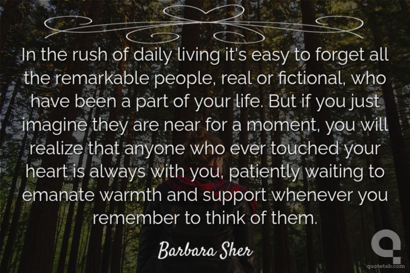 In the rush of daily living it's easy to forget all the remarkable people, real or fictional, who have been a part of your life. But if you just imagine they are near for a moment, you will realize that anyone who ever touched your heart is always with you, patiently waiting to emanate warmth and support whenever you remember to think of them.