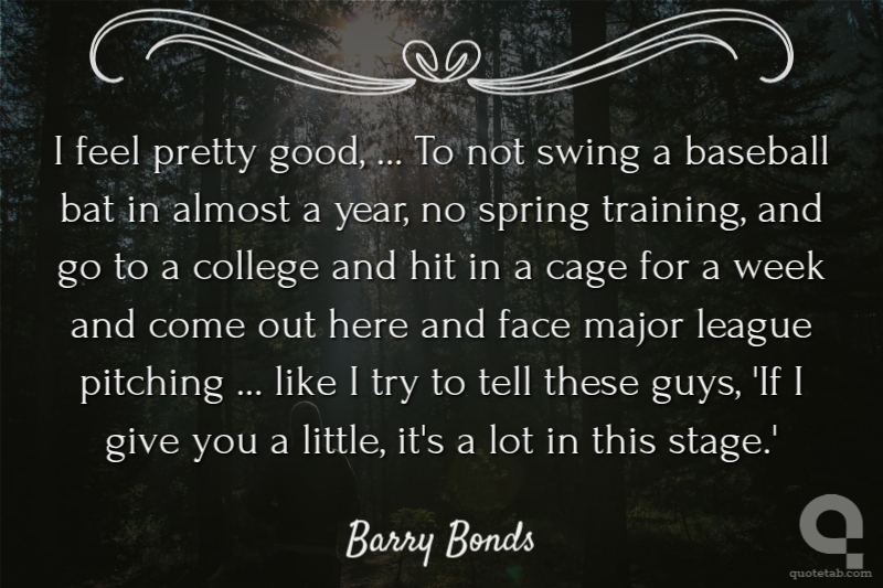I feel pretty good, ... To not swing a baseball bat in almost a year, no spring training, and go to a college and hit in a cage for a week and come out here and face major league pitching ... like I try to tell these guys, 'If I give you a little, it's a lot in this stage.'