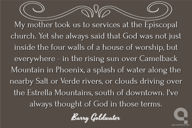 My mother took us to services at the Episcopal church. Yet she always said that God was not just inside the four walls of a house of worship, but everywhere - in the rising sun over Camelback Mountain in Phoenix, a splash of water along the nearby Salt or Verde rivers, or clouds driving over the Estrella Mountains, south of downtown. I've always thought of God in those terms.