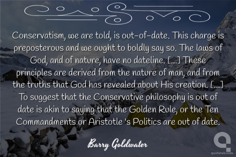 Conservatism, we are told, is out-of-date. This charge is preposterous and we ought to boldly say so. The laws of God, and of nature, have no dateline. [...] These principles are derived from the nature of man, and from the truths that God has revealed about His creation. [...] To suggest that the Conservative philosophy is out of date is akin to saying that the Golden Rule, or the Ten Commandments or Aristotle 's Politics are out of date.