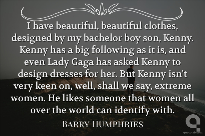 I have beautiful, beautiful clothes, designed by my bachelor boy son, Kenny. Kenny has a big following as it is, and even Lady Gaga has asked Kenny to design dresses for her. But Kenny isn't very keen on, well, shall we say, extreme women. He likes someone that women all over the world can identify with.