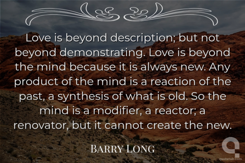 Love is beyond description; but not beyond demonstrating. Love is beyond the mind because it is always new. Any product of the mind is a reaction of the past, a synthesis of what is old. So the mind is a modifier, a reactor; a renovator, but it cannot create the new.