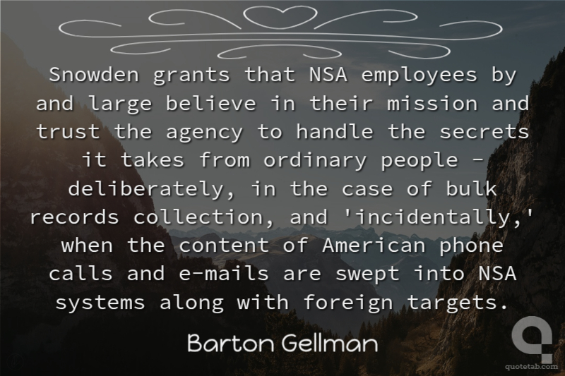 Snowden grants that NSA employees by and large believe in their mission and trust the agency to handle the secrets it takes from ordinary people - deliberately, in the case of bulk records collection, and 'incidentally,' when the content of American phone calls and e-mails are swept into NSA systems along with foreign targets.