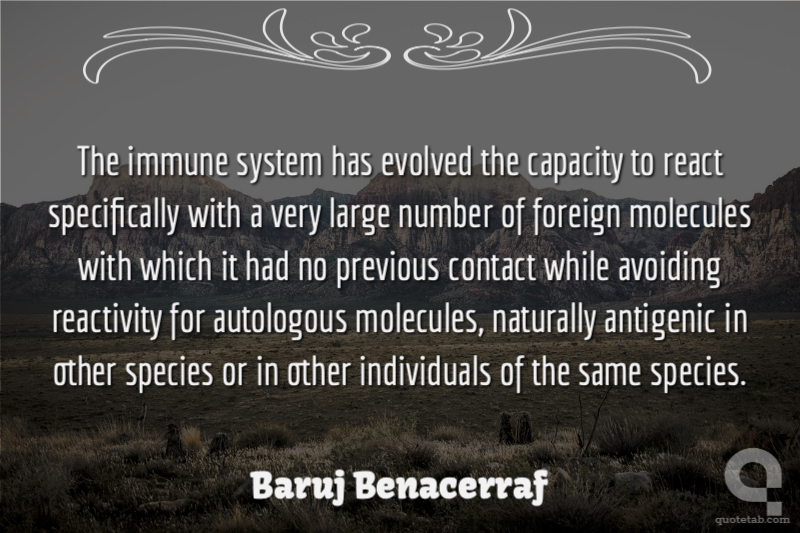 Baruj Benacerrafwas a Venezuelan-born American immunologist, who shared the 1980 Nobel Prize in Physiology or Medicine for the "discovery of the major histocompatibility complex genes which encode cell surface protein molecules important for the immune system's distinction between self and non-self". His colleagues and shared recipients were Jean Dausset and George Davis Snell...
