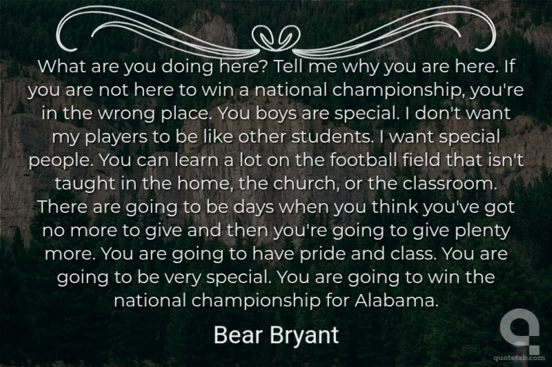 What are you doing here? Tell me why you are here. If you are not here to win a national championship, you're in the wrong place. You boys are special. I don't want my players to be like other students. I want special people. You can learn a lot on the football field that isn't taught in the home, the church, or the classroom. There are going to be days when you think you've got no more to give and then you're going to give plenty more. You are going to have pride and class. You are going to be very special. You are going to win the national championship for Alabama.