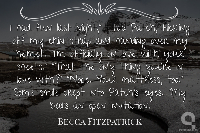 I had fun last night," I told Patch, flicking off my chin strap and handing over my helmet. "I'm officially on love with your sheets." "That the only thing you're in love with?" "Nope. Your mattress, too." Some smile crept into Patch's eyes. "My bed's an open invitation.