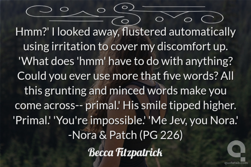 Hmm?' I looked away, flustered automatically using irritation to cover my discomfort up. 'What does 'hmm' have to do with anything? Could you ever use more that five words? All this grunting and minced words make you come across-- primal.' His smile tipped higher. 'Primal.' 'You're impossible.' 'Me Jev, you Nora.' -Nora & Patch (PG 226)
