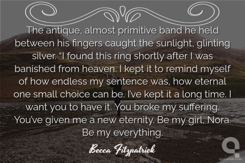 The antique, almost primitive band he held between his fingers caught the sunlight, glinting silver. “I found this ring shortly after I was banished from heaven. I kept it to remind myself of how endless my sentence was, how eternal one small choice can be. I’ve kept it a long time. I want you to have it. You broke my suffering. You’ve given me a new eternity. Be my girl, Nora. Be my everything.