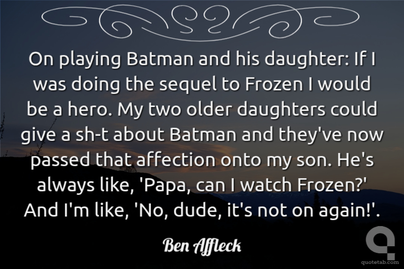 On playing Batman and his daughter: If I was doing the sequel to Frozen I would be a hero. My two older daughters could give a sh-t about Batman and they've now passed that affection onto my son. He's always like, 'Papa, can I watch Frozen?' And I'm like, 'No, dude, it's not on again!'.
