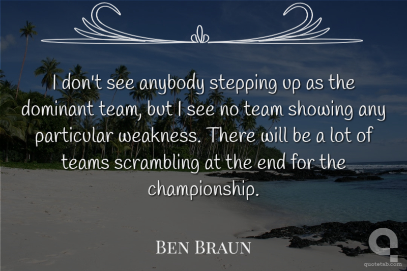 I don't see anybody stepping up as the dominant team, but I see no team showing any particular weakness. There will be a lot of teams scrambling at the end for the championship.