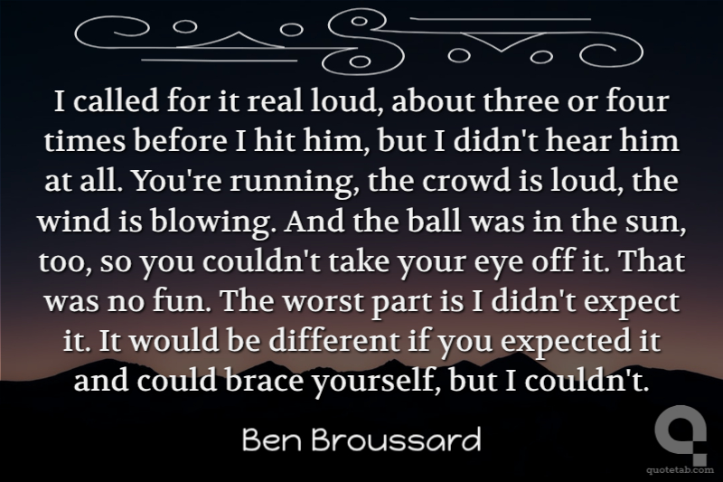 I called for it real loud, about three or four times before I hit him, but I didn't hear him at all. You're running, the crowd is loud, the wind is blowing. And the ball was in the sun, too, so you couldn't take your eye off it. That was no fun. The worst part is I didn't expect it. It would be different if you expected it and could brace yourself, but I couldn't.