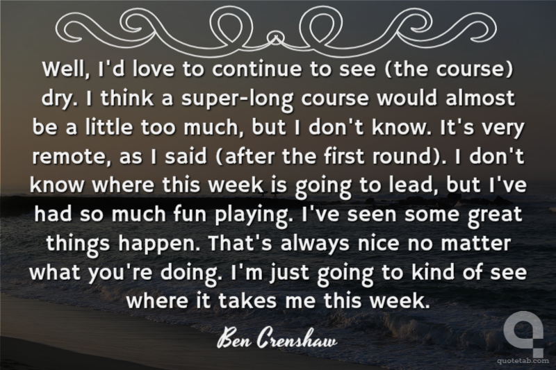 Well, I'd love to continue to see (the course) dry. I think a super-long course would almost be a little too much, but I don't know. It's very remote, as I said (after the first round). I don't know where this week is going to lead, but I've had so much fun playing. I've seen some great things happen. That's always nice no matter what you're doing. I'm just going to kind of see where it takes me this week.