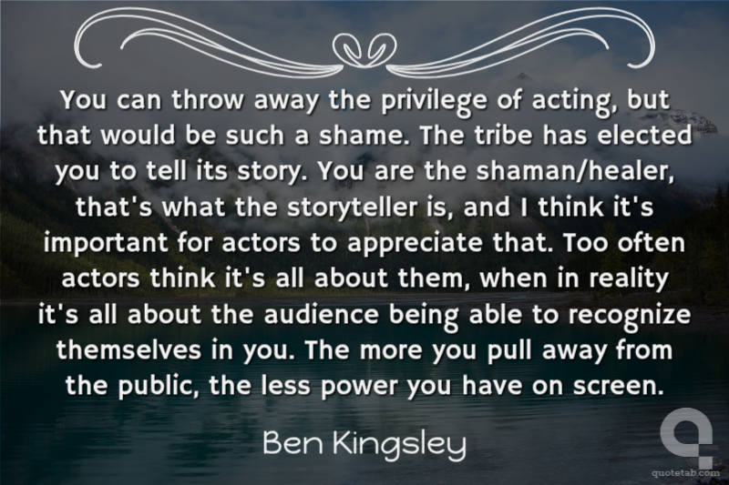 You can throw away the privilege of acting, but that would be such a shame. The tribe has elected you to tell its story. You are the shaman/healer, that's what the storyteller is, and I think it's important for actors to appreciate that. Too often actors think it's all about them, when in reality it's all about the audience being able to recognize themselves in you. The more you pull away from the public, the less power you have on screen.