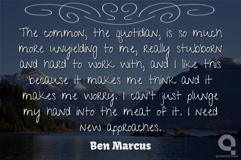 The common, the quotidian, is so much more unyielding to me, really stubborn and hard to work with, and I like this because it makes me think and it makes me worry. I can't just plunge my hand into the meat of it. I need new approaches.