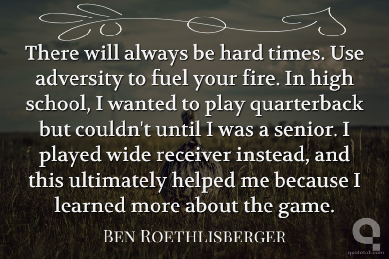 There will always be hard times. Use adversity to fuel your fire. In high school, I wanted to play quarterback but couldn't until I was a senior. I played wide receiver instead, and this ultimately helped me because I learned more about the game.