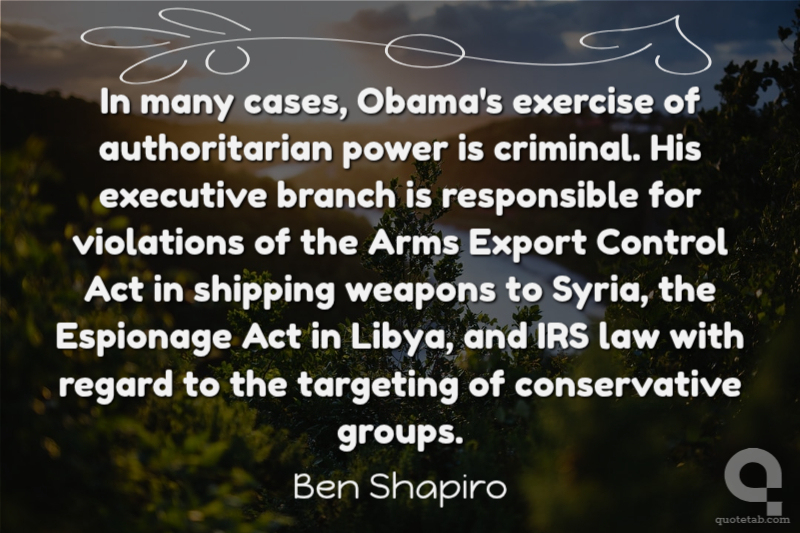 In many cases, Obama's exercise of authoritarian power is criminal. His executive branch is responsible for violations of the Arms Export Control Act in shipping weapons to Syria, the Espionage Act in Libya, and IRS law with regard to the targeting of conservative groups.