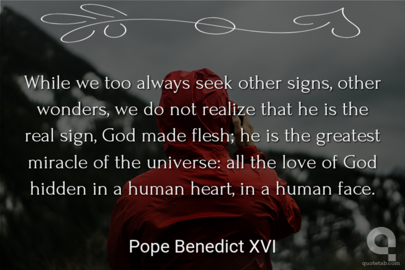 While we too always seek other signs, other wonders, we do not realize that he is the real sign, God made flesh; he is the greatest miracle of the universe: all the love of God hidden in a human heart, in a human face.