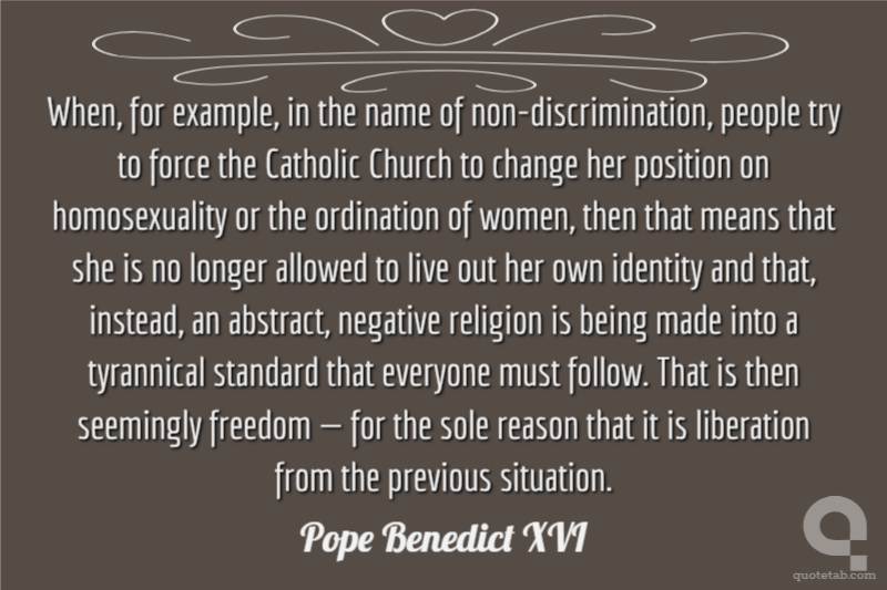 When, for example, in the name of non-discrimination, people try to force the Catholic Church to change her position on homosexuality or the ordination of women, then that means that she is no longer allowed to live out her own identity and that, instead, an abstract, negative religion is being made into a tyrannical standard that everyone must follow. That is then seemingly freedom — for the sole reason that it is liberation from the previous situation.