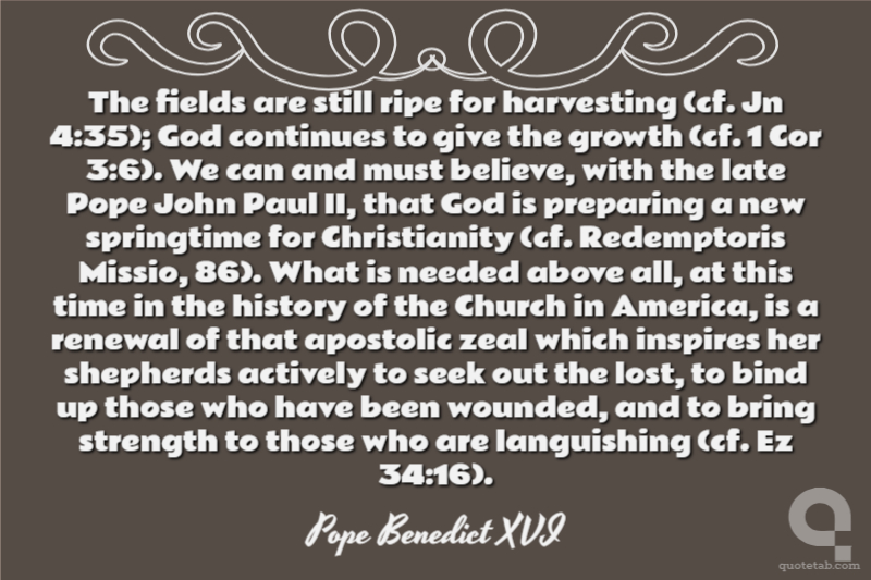 The fields are still ripe for harvesting (cf. Jn 4:35); God continues to give the growth (cf. 1 Cor 3:6). We can and must believe, with the late Pope John Paul II, that God is preparing a new springtime for Christianity (cf. Redemptoris Missio, 86). What is needed above all, at this time in the history of the Church in America, is a renewal of that apostolic zeal which inspires her shepherds actively to seek out the lost, to bind up those who have been wounded, and to bring strength to those who are languishing (cf. Ez 34:16).