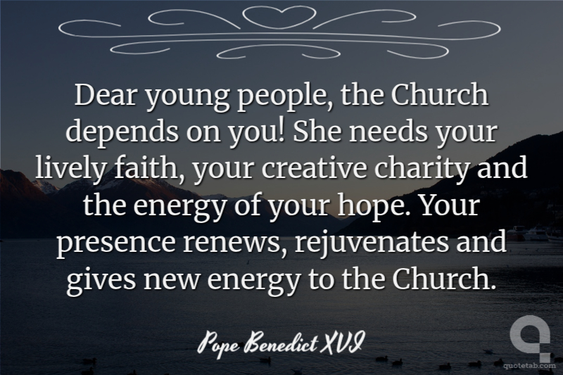 Dear young people, the Church depends on you! She needs your lively faith, your creative charity and the energy of your hope. Your presence renews, rejuvenates and gives new energy to the Church.
