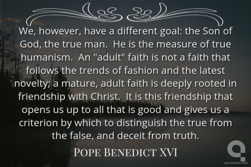 We, however, have a different goal: the Son of God, the true man. He is the measure of true humanism. An "adult" faith is not a faith that follows the trends of fashion and the latest novelty; a mature, adult faith is deeply rooted in friendship with Christ. It is this friendship that opens us up to all that is good and gives us a criterion by which to distinguish the true from the false, and deceit from truth.