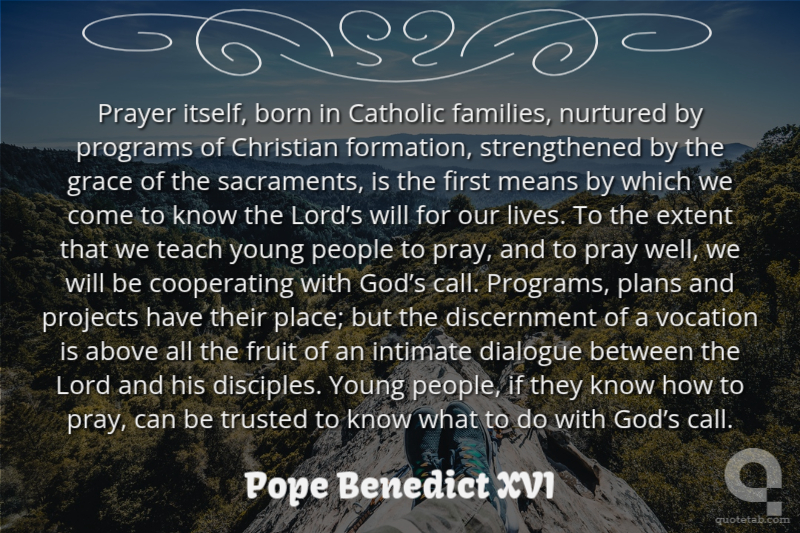 Prayer itself, born in Catholic families, nurtured by programs of Christian formation, strengthened by the grace of the sacraments, is the first means by which we come to know the Lord’s will for our lives. To the extent that we teach young people to pray, and to pray well, we will be cooperating with God’s call. Programs, plans and projects have their place; but the discernment of a vocation is above all the fruit of an intimate dialogue between the Lord and his disciples. Young people, if they know how to pray, can be trusted to know what to do with God’s call.