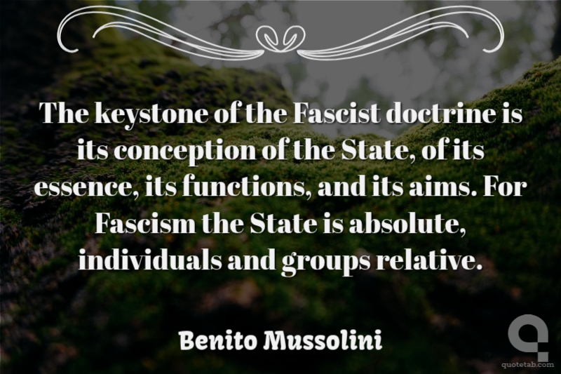 The keystone of the Fascist doctrine is its conception of the State, of its essence, its functions, and its aims. For Fascism the State is absolute, individuals and groups relative.