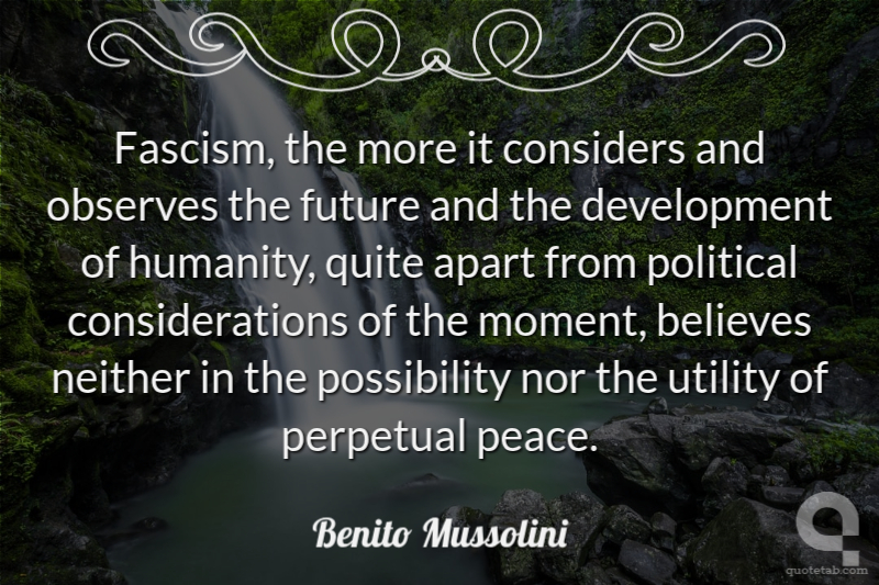 Fascism, the more it considers and observes the future and the development of humanity, quite apart from political considerations of the moment, believes neither in the possibility nor the utility of perpetual peace.