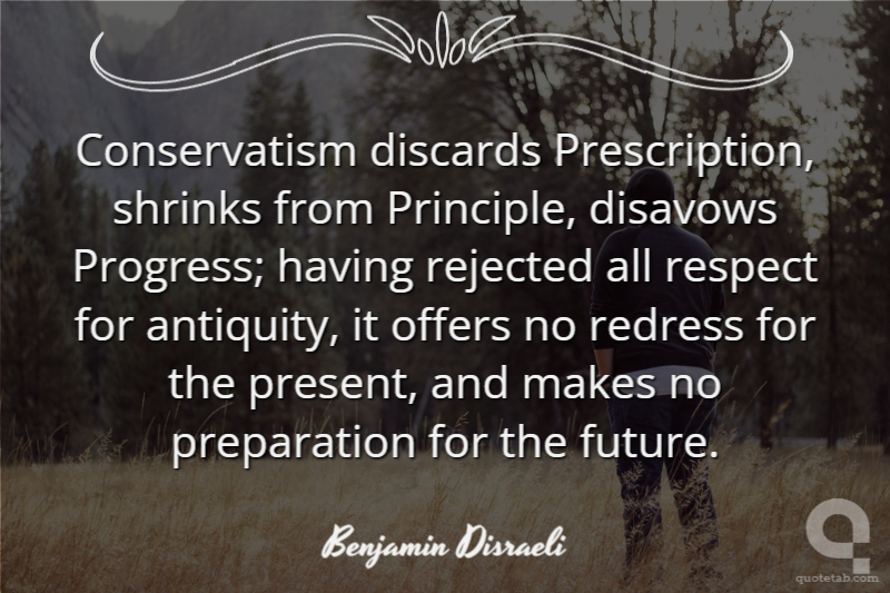Conservatism discards Prescription, shrinks from Principle, disavows Progress; having rejected all respect for antiquity, it offers no redress for the present, and makes no preparation for the future.