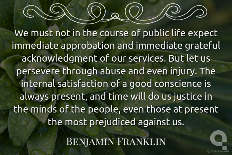 We must not in the course of public life expect immediate approbation and immediate grateful acknowledgment of our services. But let us persevere through abuse and even injury. The internal satisfaction of a good conscience is always present, and time will do us justice in the minds of the people, even those at present the most prejudiced against us.