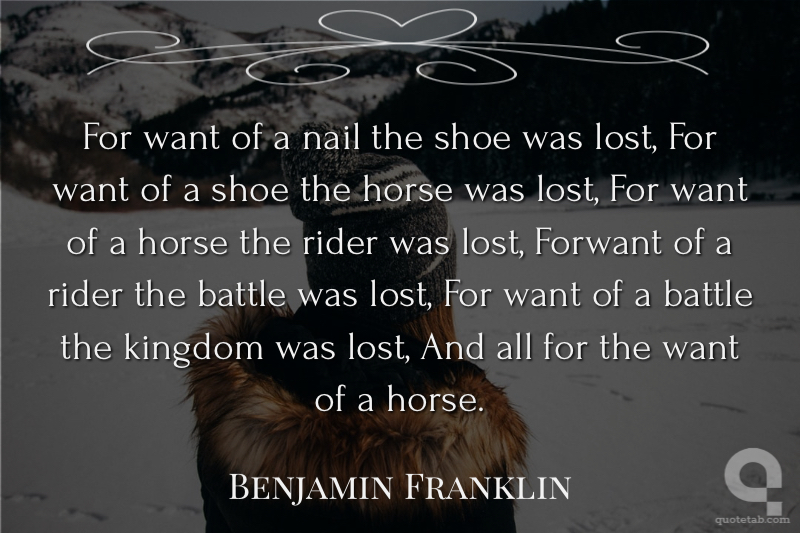 For want of a nail the shoe was lost, For want of a shoe the horse was lost, For want of a horse the rider was lost, Forwant of a rider the battle was lost, For want of a battle the kingdom was lost, And all for the want of a horse.