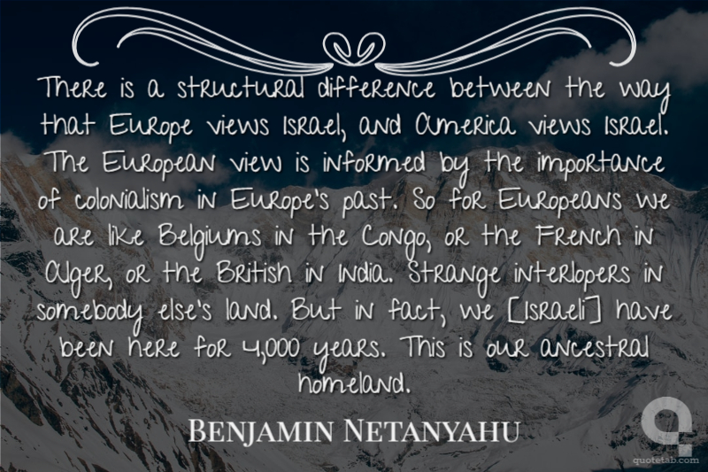 There is a structural difference between the way that Europe views Israel, and America views Israel. The European view is informed by the importance of colonialism in Europe's past. So for Europeans we are like Belgiums in the Congo, or the French in Alger, or the British in India. Strange interlopers in somebody else's land. But in fact, we [Israeli] have been here for 4,000 years. This is our ancestral homeland.