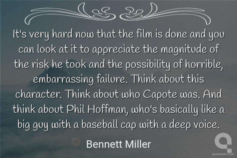It's very hard now that the film is done and you can look at it to appreciate the magnitude of the risk he took and the possibility of horrible, embarrassing failure. Think about this character. Think about who Capote was. And think about Phil Hoffman, who's basically like a big guy with a baseball cap with a deep voice.