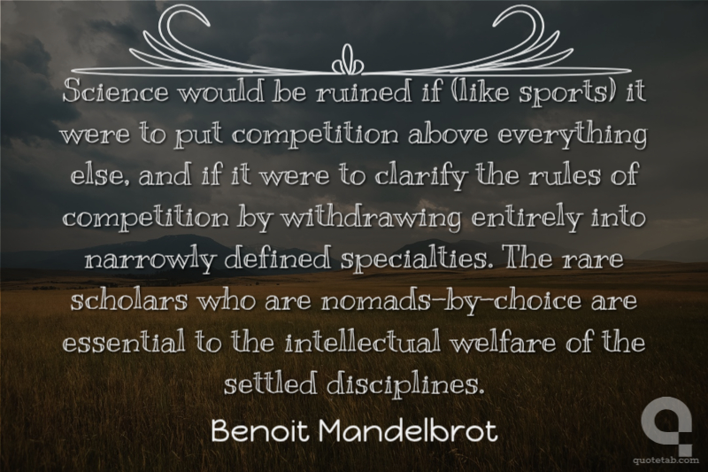 Science would be ruined if (like sports) it were to put competition above everything else, and if it were to clarify the rules of competition by withdrawing entirely into narrowly defined specialties. The rare scholars who are nomads-by-choice are essential to the intellectual welfare of the settled disciplines.