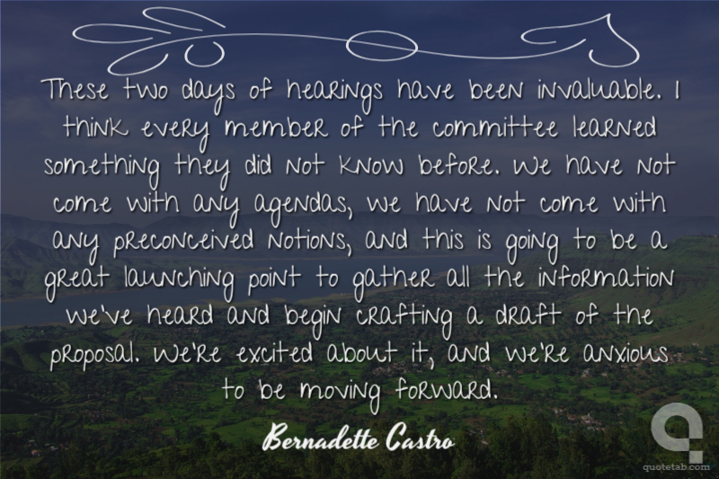 These two days of hearings have been invaluable. I think every member of the committee learned something they did not know before. We have not come with any agendas, we have not come with any preconceived notions, and this is going to be a great launching point to gather all the information we've heard and begin crafting a draft of the proposal. We're excited about it, and we're anxious to be moving forward.