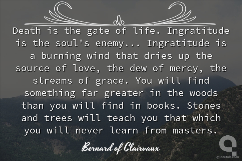 Death is the gate of life. Ingratitude is the soul's enemy... Ingratitude is a burning wind that dries up the source of love, the dew of mercy, the streams of grace. You will find something far greater in the woods than you will find in books. Stones and trees will teach you that which you will never learn from masters.